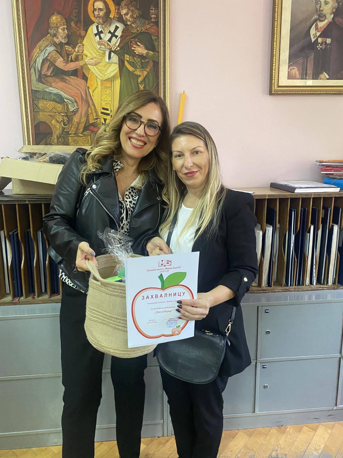 Поводом Дана јабука ученици наше школе посетили су ОШ „Марија Бурсаћ“ где су учествовали у инклузивној радионици „Дани јабука“. Радионица је била прилагођена ученицима са тешкоћама у развоју, а ученик наше школе Матеја Милошевић освојио је прво место на такмичарском квизу. Након тога уследила је заједничка активност садње дрвета јабуке у школском дворишту. По завршетку радионице посета је уприличена ђачким дружењем и послужењем различитих производа од јабука. Захваљујемо се ОШ „Марија Бурсаћ“ на позиву, дугогодишњој сарадњи и подршци коју пружа нашој школи.