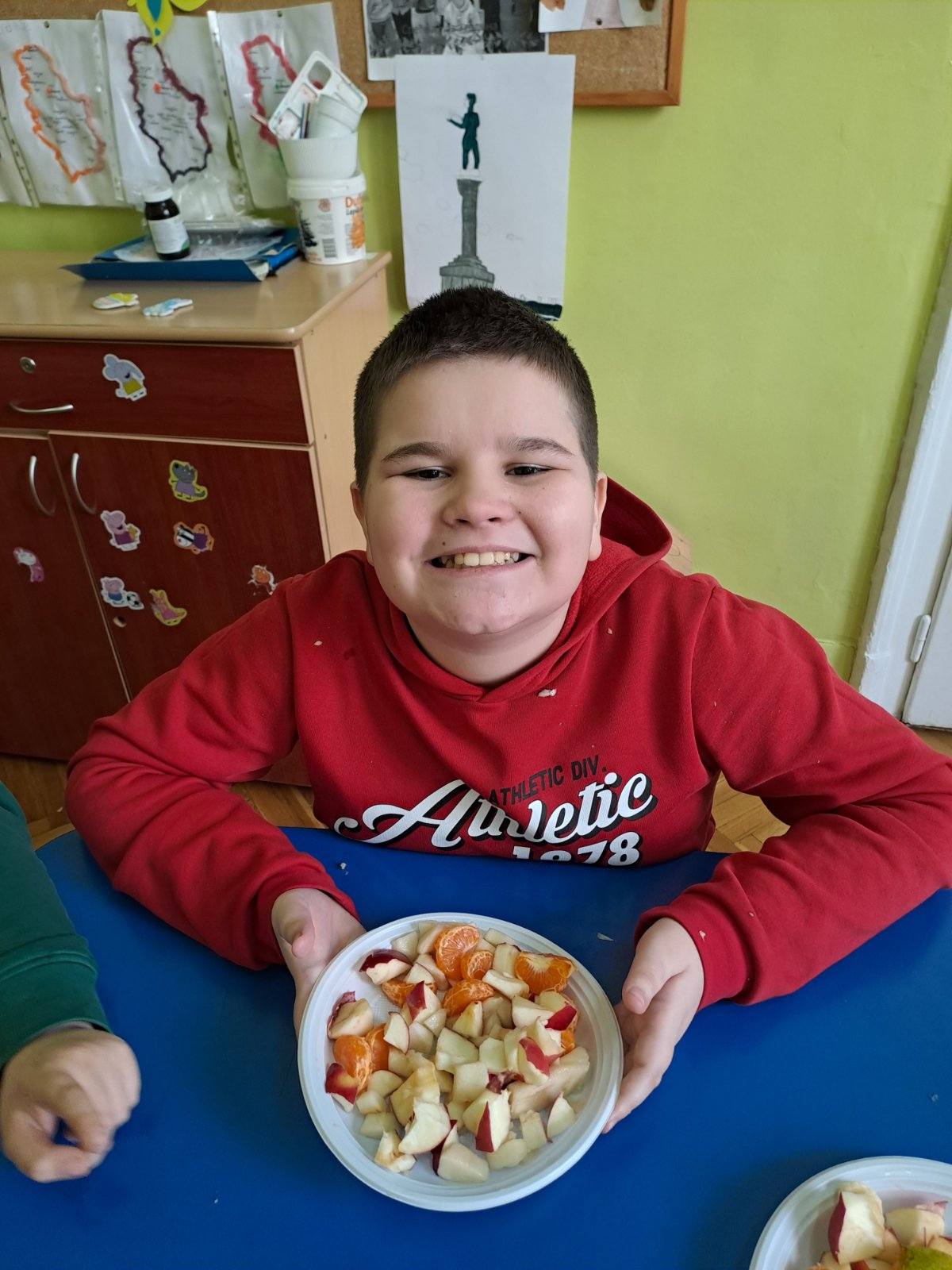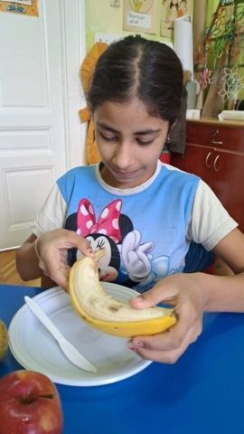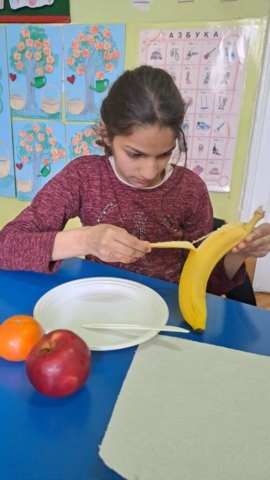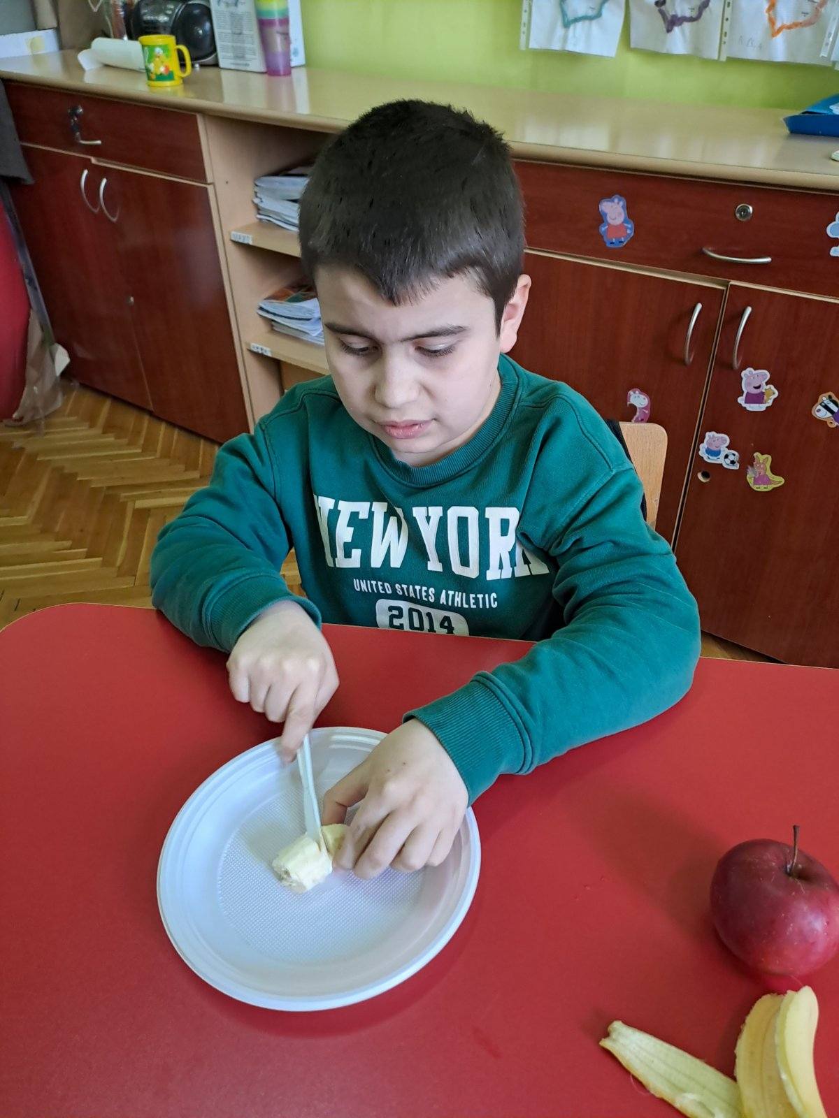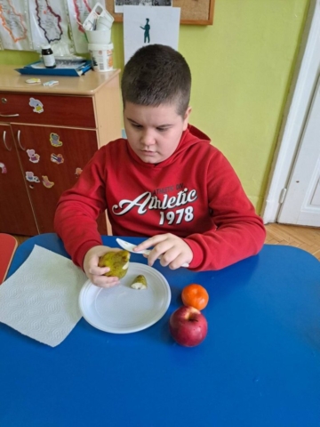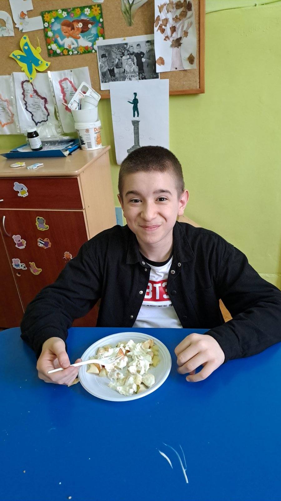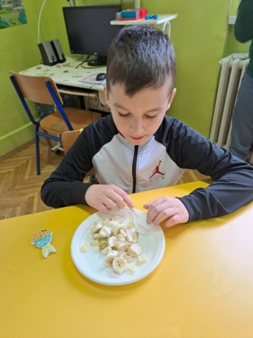 На часу природе и друштва учили смо смеше. Како би ученицима било јасније и видљивије шта све чини једну смешу правили смо воћну салату. Ученици су самостално прошли кроз сваки корак користећи све што је потребно. На часу смо развијали међупредметне компетенције као што су сарадња (ученика IV разреда и ученика II разреда, као и преношење знања ученика виших разреда на ученике нижих) као и одговоран однос према здрављу (у оквиру чега смо понављали и допуњавали знања о томе зашто је важно редовно јести воће).